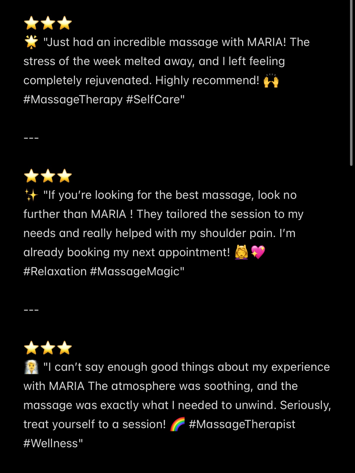 I’m warm, friendly, and outgoing, with a passion for creating a positive and relaxing experience. Your comfort and satisfaction are always my top priority. 🌸✨ Enjoy a calming, unforgettable session with me 🥰😘who truly cares about helping you unwind. I take pride in offering a professional, personalized experience that you’ll remember for all the right reasons. 😊 The experience is centered around your comfort and enjoyment.